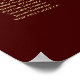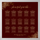 This wedding seating chart includes table assignments for 150 guests at 15 tables. The design is simple yet elegant featuring gold text on a deep auburn brown background. The title is written in lacy script calligraphy and there are faux foil frilly floral decorations in the corners. Stylish, chic and sophisticated way to help your guests find their seats at your reception.