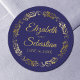 These elegant wedding stickers feature fancy gold script text on a navy blue background with a lacy gold faux foil floral border. The text is fully customizable and contains the wedding couple's names and wedding date. Great as favor tags or envelope seals!