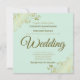 This simple wedding invitation features a pale green or neo mint coloured background with lacy faux foil gold curls and swirls in the corners. The wording is formal with elegant script gold lettering.