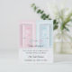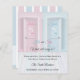 A budget baby shower or gender reveal invitation. The design consists of light pink and blue restroom doors, titled ladies and gents, with a baby in a pink and blue nappy respectively. The typography text reads he or she, what will baby be? Personalise by adding your full event and contact details to the front and back.