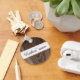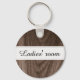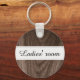 Ladies room keychain with a printed, brown wood grain background and customisable text "Ladies' room".