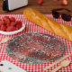 Imagem de pequenos quadrados tipo pixels que lembram uma parede de ladrilhos ou cerâmica vermelho, porém, com muitas manchas e pequenos respingos que parecem manchas e borrões de tinta spray.