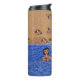 This thermal tumbler bottle to keep your drinks cold or hot has a lady and her black and white cat swimming in red inner tubes in the blue ocean with a grey dolphin jumping out of the water. A sandy beach with colourful umbrellas is behind them. Customise your name with the template.