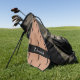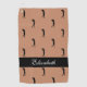 Design features a repeating pattern of a solid black silhouette of a female golfer on a light cantaloupe orange background. A thick black band showcases custom name or text in stylish white script. Customise colours or keep as created. Colour of background and fonts are easily changed in design tool section. Email me at beachpausedesigns@gmail.com if you have questions about this or any of our designs!