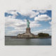 View of the Statue of Liberty in New York Harbour against a blue summer sky with puffy white clouds