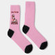Pink colour socks with a pink roller skate and red lettering. Guess if it's intended for a male roller skater or a female inline skater?