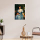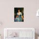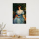 “Lady Violet Henderson” by John William Waterhouse presents a poised young woman seated in a lush garden, framed by deep green foliage and clusters of soft pink roses. She wears a pale blue dress with airy white ruffles that catch the light, the fabric painted with delicate, shimmering touches that make the folds feel alive. A warm, rust colored shawl slips across her lap, adding a rich contrast to the cool blues and creamy whites. In her hand she holds a rose, echoing the blooms around her and gently guiding your eye back to her calm, direct gaze.