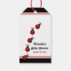Ladybug baby shower gift tags with adorable blonde baby girl wearing a cute red and black outfit with pearls on a red and black background with ladybugs on the back side. You can add the text of your choice to the front and back.