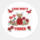 A teddy bear ladybug, red heart flowers, and text text that reads "Look Who's Three" on a cute 3rd birthday design.