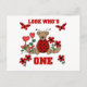 A teddy bear ladybug, red heart flowers, and text text that reads "Look Who's One" on cute 1st birthday Tshirts, bodysuits, cards, stickers, buttons, and more.