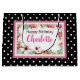 Personalise this big and cute birthday gift bag with your child's name. Design in a ladybug theme of whimsical flowers, black polka dots and dark pink ladybugs. See matching wrapping paper, gift tags and other coordinating items in this same collection. Created in part with graphics by Trina Clark purchased at digiscrapkits.com