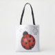 This tote has a single Ladybug on the front and a customisable text section. You can add your name or the name of a friend or business. You can also put in a quote, or anything you wish. You should be able to hide or delete this option if you do not wish to have any text. The back is tiled with Ladybugs.