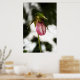 A close up photograph of a pink Lady's Slipper that has grown in the shade of a tree.