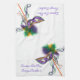 16” x 24” kitchen towel with an image, on both ends, of a beautiful purple, green and gold satin mask on a stick with coordinating feathers and ribbons, green and purple Mardi Gras beads, and the phrase “Laissez Les Bon Temps Rouler!” (French for "Let the Good Times Roll!") in purple French script. See matching cloth napkin, paper cocktail napkin, cloth placemat, paper placemat and coasters. See the entire Mardi Gras Kitchen Towel collection in the FOOD/BEV | Linens section.