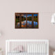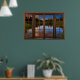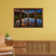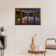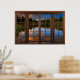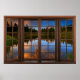 The artwork creates the illusion of having a window on your wall. The illusion gives the feeling of looking out at a calm lake with greenery and mountains. A Very unique and original poster!