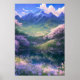This digital artwork showcases a stunning lake nestled at the bottom of a green valley, adorned with pink flowers and cherry blossoms. The beauty of the scene is further enhanced by the presence of majestic snowy mountains on the horizon. The artwork invites the viewer to immerse themselves in the serene ambiance, envisioning the reflection of the surrounding beauty in the calm waters of the lake and appreciating the harmonious blend of colours and elements that nature has to offer.