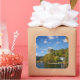 Photo sticker with Bled castle on a high cliff above Lake Bled, surrounded by trees with foliage in autumn colours in a beautiful fall landscape in Bled, Slovenia.