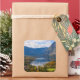Square photo sticker with a ferry boat on Lake Bohinj approaching the town Ribcev Laz with the prominent church in an autumn landscape with forests with trees in fall colours in Triglav National Park near Bled in Slovenia.