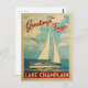 This Greetings From Lake Champlain vintage travel nautical design features a boat sailing on the water with seagulls and a blue sky filled with gorgeous puffy white clouds.