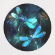Two transparent, luminous, turquoise, artistically drawn dragonflies on night background with luminescent lake algae and fireflies. Glowing dragonfly.
