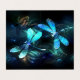 Two transparent, luminous, turquoise, artistically drawn dragonflies on night background with luminescent lake algae and fireflies. Glowing dragonfly.