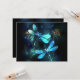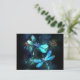 Two transparent, luminous, turquoise, artistically drawn dragonflies on night background with luminescent lake algae and fireflies. Glowing dragonfly.