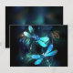 Two transparent, luminous, turquoise, artistically drawn dragonflies on night background with luminescent lake algae and fireflies. Glowing dragonfly.
