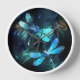 Two transparent, luminous, turquoise, artistically drawn dragonflies on night background with luminescent lake algae and fireflies. Glowing dragonfly.