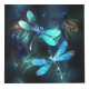 Two transparent, luminous, turquoise, artistically drawn dragonflies on night background with luminescent lake algae and fireflies. Glowing dragonfly.