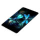 Two transparent, luminous, turquoise, artistically drawn dragonflies on night background with luminescent lake algae and fireflies. Glowing dragonfly.