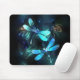 Two transparent, luminous, turquoise, artistically drawn dragonflies on night background with luminescent lake algae and fireflies. Glowing dragonfly.