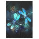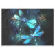 Two transparent, luminous, turquoise, artistically drawn dragonflies on night background with luminescent lake algae and fireflies. Glowing dragonfly.