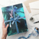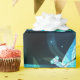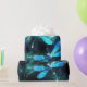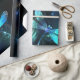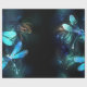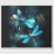 Two transparent, luminous, turquoise, artistically drawn dragonflies on night background with luminescent lake algae and fireflies. Glowing dragonfly.