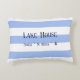 Classic Lake house blue and white horizontal stripes pillow. Personalise family name and lake house coordinates. Trendy customisable light blue and white stripes pillow features your lake house latitude and longitude. Search for your coordinates on any mapping site and enter them in the template field provided. Typography is in retro vintage lettering. Makes a unique custom housewarming gift for new homeowners and a perfect addition to your lakeside home.