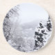 A photograph showing just a glimpse of the mountain lake through snow-covered fir trees. This landscape picture is digitally manipulated to look like a watercolor.