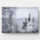A photograph showing just a glimpse of the mountain lake through snow-covered fir trees. This landscape picture is digitally manipulated to look like a watercolor.