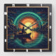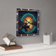 This illustration showcases a peaceful fishing scene with a man in a boat on a tranquil lake. The sky is a dramatic mix of sunset hues and a dark, tooled, neon-coloured background. The intricate details of the foreground, including glowing fish and detailed foliage, are a striking contrast to the vast landscape.