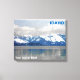Looking east from Sandpoint, ID across Lake Pend Oreille (pond uh-ray) on a winter day; snow-covered mountains in the distance. Ice has formed at the shore and extends part way across the lake. Blues and greys are the predominate colours. Customisable text reading "IDAHO" also appears. There is also a place to add additional text.