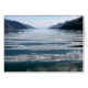 Reflections looking down the lake from my boat, mountains in the distance. Clouds and sky seen on the surface of the lake.