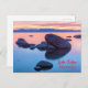 The image captures a serene lakeside scene at sunset. The water is calm and reflects the sky, creating a gradient of soft pink and blue hues. Several large, smooth rocks are scattered across the water, their reflections adding to the tranquil atmosphere. In the distance, a mountain range is visible against the fading light of the sky, adding depth and grandeur to the composition.