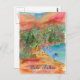 A watercolor painting of summer in Lake Tahoe Southshore with beach umbrellas and the lovely blue water.