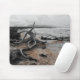 Lake Tyrrell is a salt lake located seven kilometers north of Sea Lake in Victoria, Australia. In this image taken at Lake Tyrrell, gnarled and weathered tree trunks lie strewn about a sandy shore, exhibiting evidence of natural forces at work. The contrasting colors of the muted sky and the vibrant sandy ground set a dramatic scene, further accentuating the desolate beauty of the landscape.