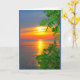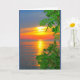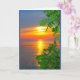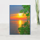 A photograph of an orange, yellow and blue lake sunset, framed by bright green branches, is the subject of my "Lake Winnebago Sunset Thinking Of You" card. I captured this scene along the shoreline of Beautiful Lake Winnebago in Quinney, Wisconsin.