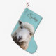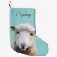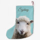Lamb on blue, custom Christmas stocking printed on both sides to hang whichever way you choose. Or choose the red reverse colour. A cute little sheep stares out from a light blue background on this holiday stocking with name template in script font. For the animal lover or farm family.