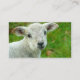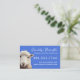 Knitting themed business cards. Sheep face on periwinkle blue cards with white text. Name at the top in script, with phone number contact and smaller print for website and whatever is needed.
