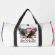 This white duffle bag features a powerful patriotic design with a majestic bald eagle in flight against a distressed American flag backdrop. The text "Land of the Free Because of the Brave" is prominently displayed below. This design is perfect for showing pride and gratitude for American freedom and military service. Edit colour of the bag caps and body in the Design tool to your favored colours.