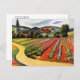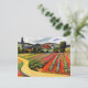 A postcard with the painting, Landscape in Tegernsee, by August Macke (1887-1914). He was a German Expressionist artist who died during WWI and had been a leading member of the group Der Blaue Reiter. A dirt path through a warmly lit country landscape of farming fields and houses, with a steeple in the background. Tegernsee is a village in Bavaria, Germany.