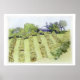 Illustration of a rural landscape, the green countryside, a farmhouse set on a hill and trees etched onto the sky. The quiet peace and serenity of the country. Also a lovely matching card, stamp, sticker, magnet, bag, mousepad, t-shirt.
