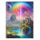 Digital art of an enchanting landscape, where two magical castles stand out in a landscape with forests, clear waters and a splendid sky with vibrant colors, celestial glow, planets and stars.