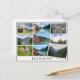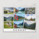 Postcard with a collage of nine photos from landscapes of the fjords, boathouses, boats, stave church, puffin, mountains and houses in Alesund in the scandinavian country Norway with a white frame and the text: 'Norway'. One photo is a bit twisted to create the idea of a loose laying photo.